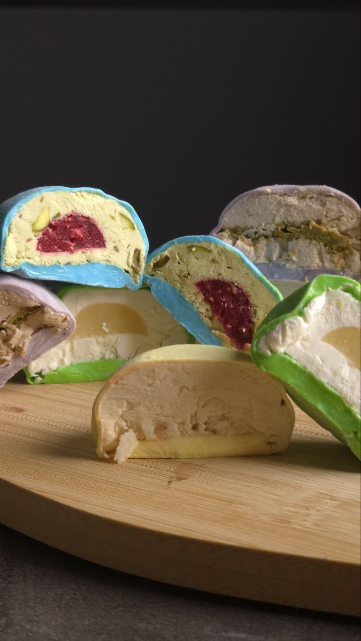 Мы готовим моти из свежих ингредиентов, добиваясь идеального баланса вкуса и текстуры: тонкое эластичное тесто, воздушный крем и насыщенная начинка в центре.