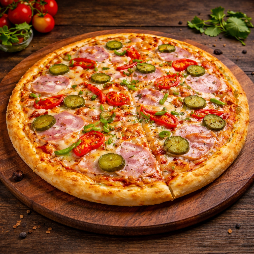 Пицца Бене с ветчиной, моцареллой, томатами и корнишоном на тесте с пицце соусом.