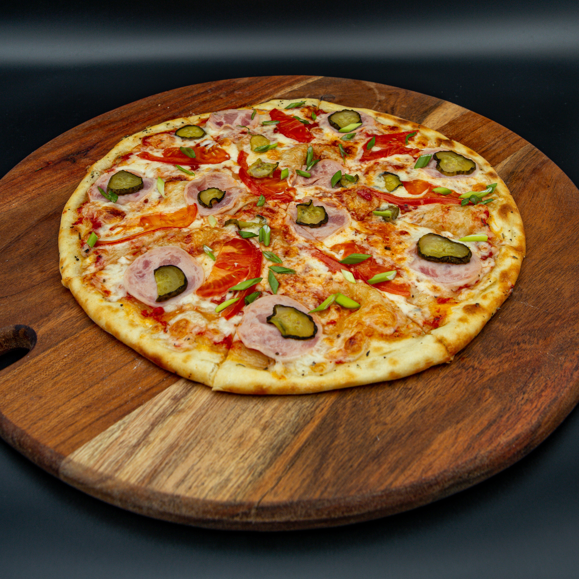 тесто, пицце соус, моцарелла, ветчина, маринованный огурчик, томаты, зеленый лук