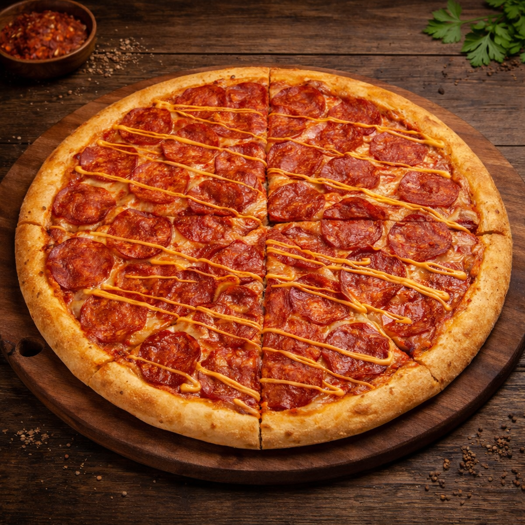 Пицца «Двойная Пеперони» с пеперони, моцареллой и спайси соусом на тесте с пицца-соусом.