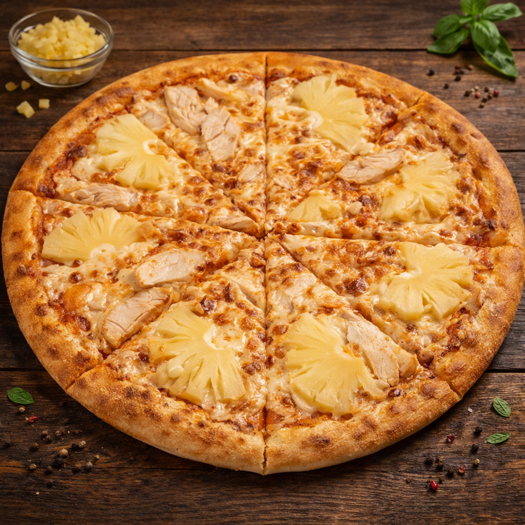 Пицца готовится на мягком тесте с пицца-соусом и сыром. Сбалансированный вкус с лёгкой сладкой ноткой, подходит для тех, кто любит классическую гавайскую пиццу.