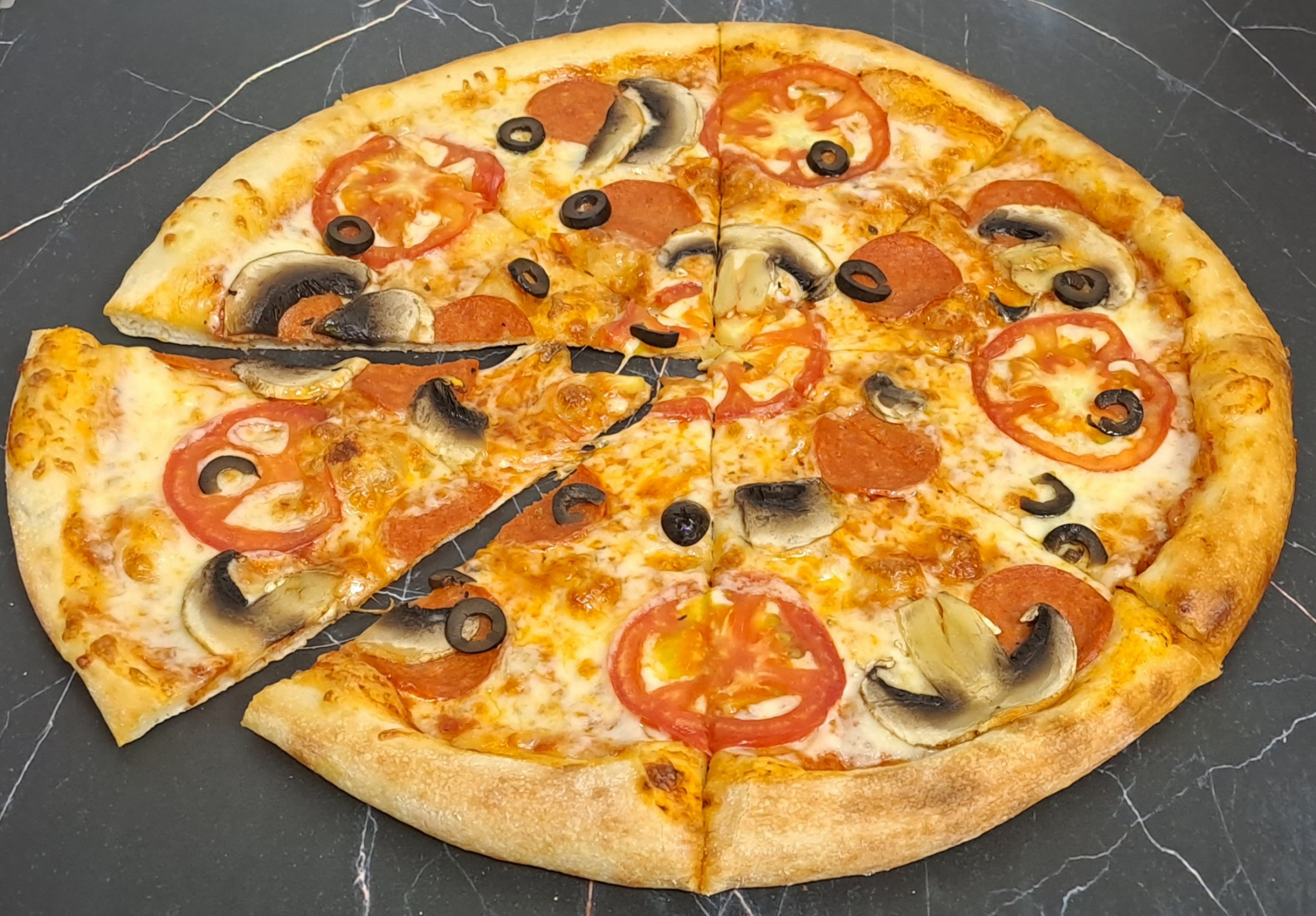 ТЕСТО, ПИЦЦЕ СОУС, СЫР, ТОМАТЫ, ШАМПИНЬОНЫ, ПЕПЕРОНИ