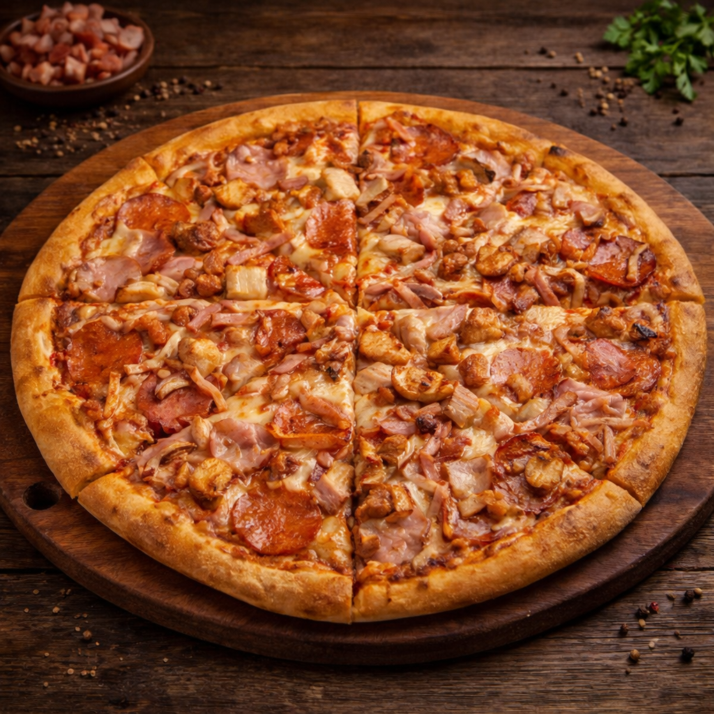 Состав: Тесто, пицце соус, сыр моцарелла, пеперони, бекон, ветчина, копченная курица.
