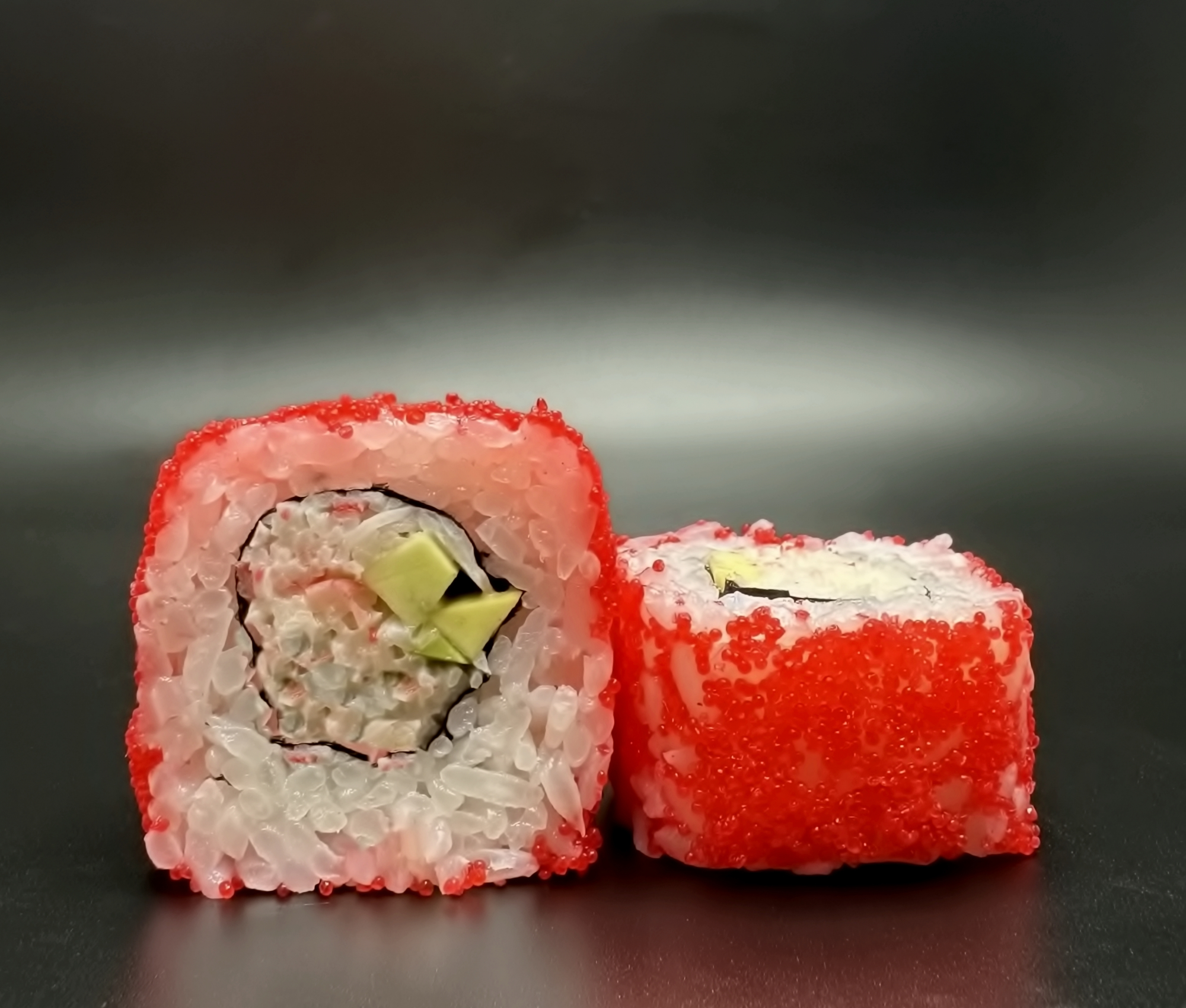 Ролл Калифорния — сочетание снежного краба, огурца и икры летучей рыбы в классическом исполнении.