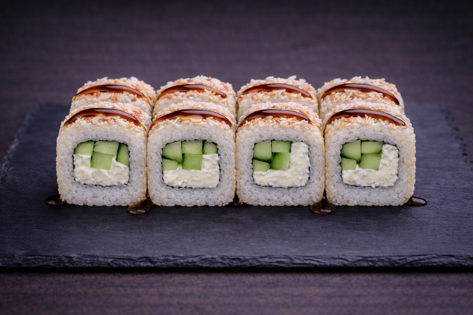 Классический ролл с мягким вкусом краба и сливочного сыра, освежённый огурцом и украшенный сладковатым унаги-соусом.