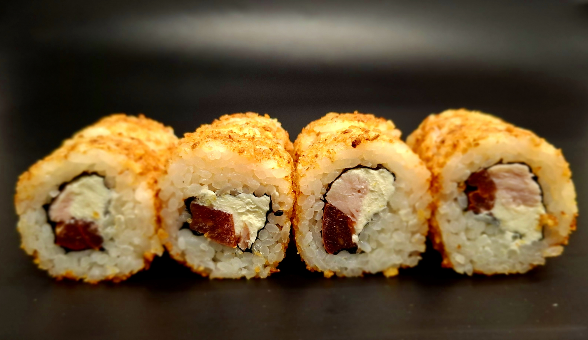 рис, нори, копчёная курица, творожный сыр, томат, лук криспи