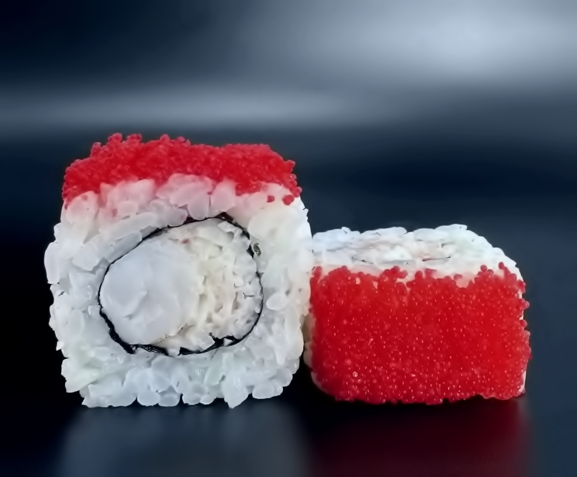 Яркий ролл с двойной морской начинкой — крабом и креветкой, украшенный икрой масаго. Один из фирменных вкусов Сурими Суши.