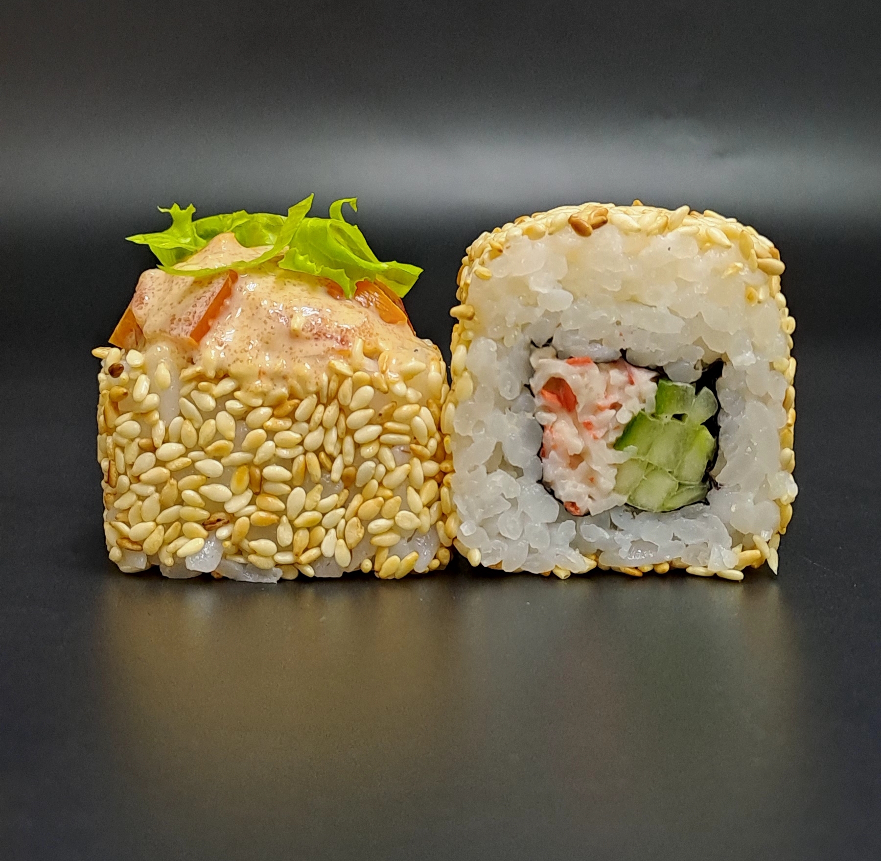 Ролл Току — яркое сочетание краба, томата и салата под спайси и яки соусами.