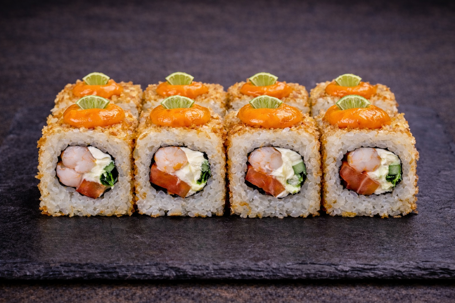 Том Ям ролл — креветка, томат, сыр и соус Том Ям с хрустящим луком фри. Взрыв вкусов, который порадует любителей остроты.