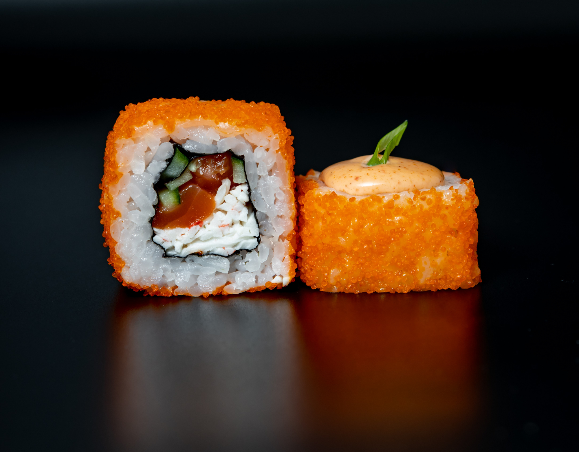 Ролл «Вулкан» — яркое сочетание краба, свежего лосося и огурца, дополненное икрой летучей рыбы и пикантным спайси соусом.