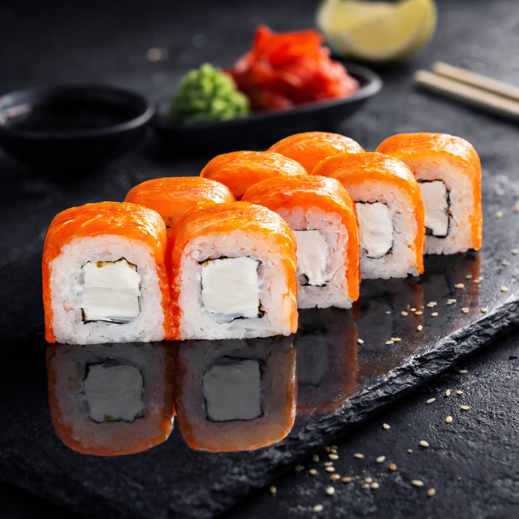 Классика японской кухни — нежный сливочный сыр и охлаждённый лосось. Один из самых популярных роллов Сурими Суши.
