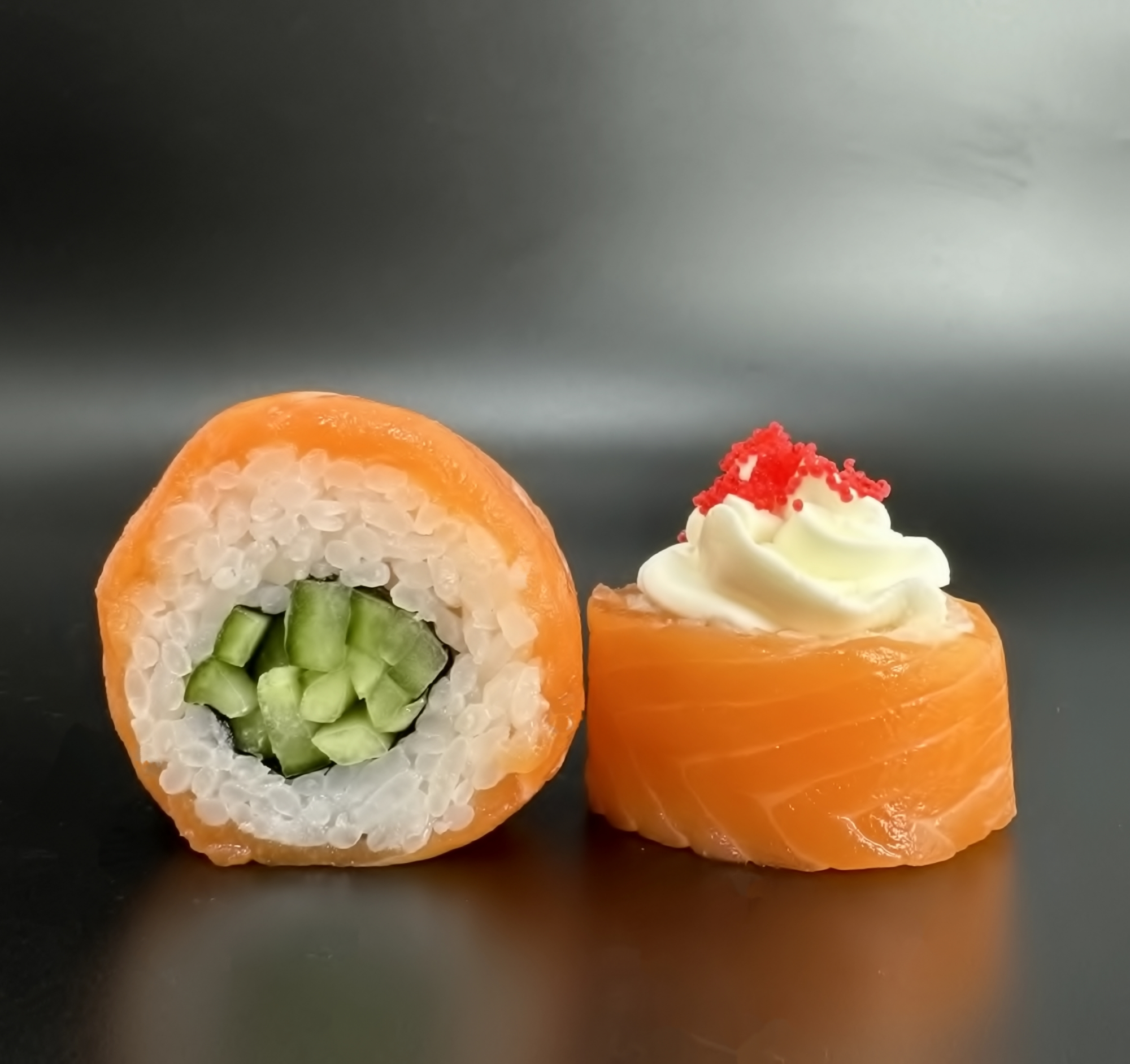 Ролл Филадельфия де люкс — двойной лосось, сливочный сыр и икра масаго для насыщенного вкуса.