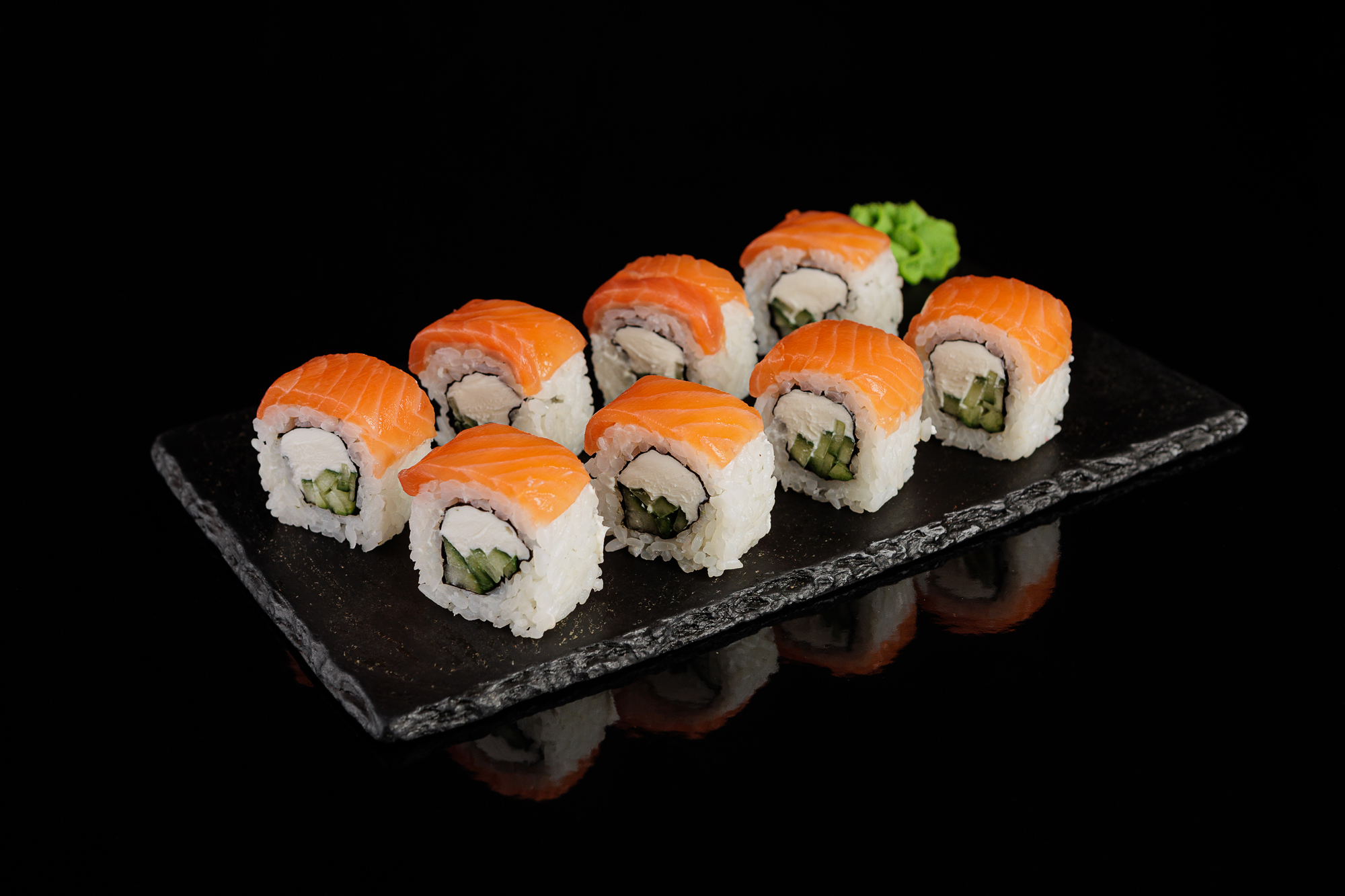 Лёгкий вариант классической Филадельфии. Нежный лосось, сливочный сыр и свежий огурец — гармоничное сочетание вкусов, знакомое всем любителям суши.