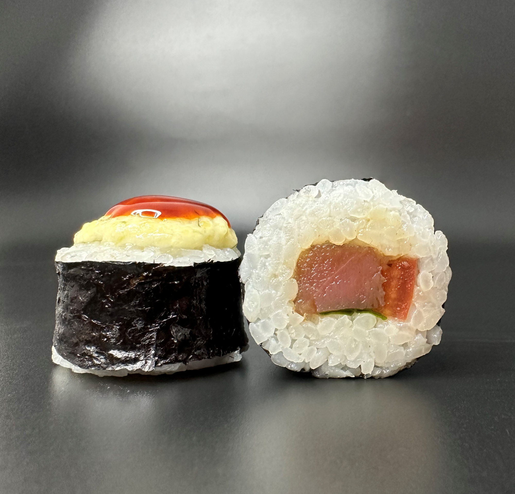 РИС, НОРИ, МАРИНОВАННЫЙ ТУНЕЦ,ЛУК ЗЕЛЕНЫЙ, ТОМАТ, СЫРНЫЙ СОУС, УНАГИ СОУОС, КУНЖУТ