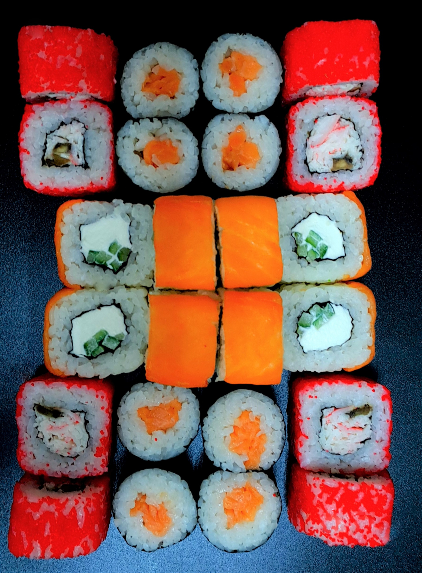Заказывали доставку роллов вечером, всё как на фото. Аккуратные кусочки и нормальный размер.