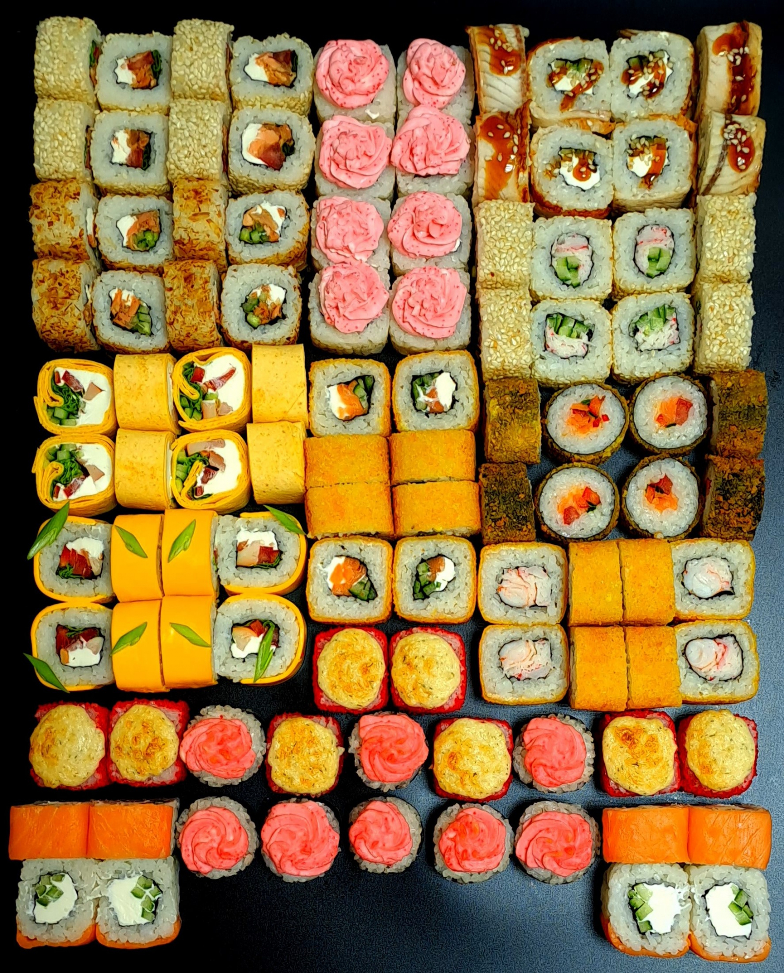 В наборе собраны самые популярные роллы: Аляска, Бонито с жареным лососем, Чикен Тортильяс, Лава с креветкой, Цезарь, Филадельфия лайт, Унаги Филадельфия, Калифорния в кунжуте, Сяке темпура, Сурими эби темпура, Самурай темпура, Лава хот, Калифорния гриль.