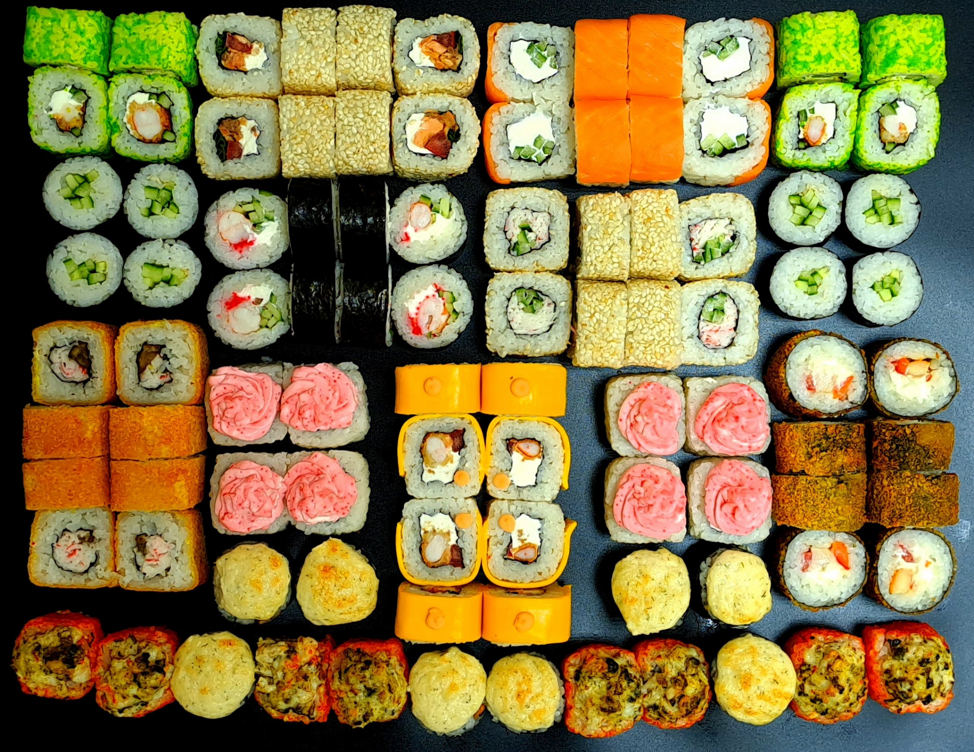 В составе: Аляска, Восходящее солнце, Филадельфия лайт, Лава, Калифорния в кунжуте, Эби чиз, Грин Дей, Чикен темпура, Сурими темпура, Капа маки, запечённый с мидиями и креветками, запечённый с лососем терияки.