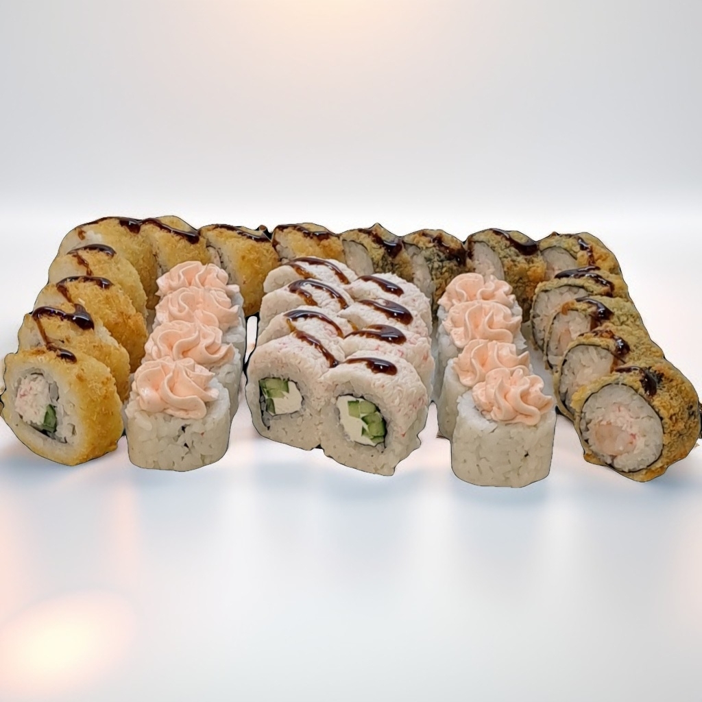 Сэт «Сурими» — 1 кг роллов с темпурой и крабом. Отличный выбор для любителей хрустящих и сочных сочетаний.
